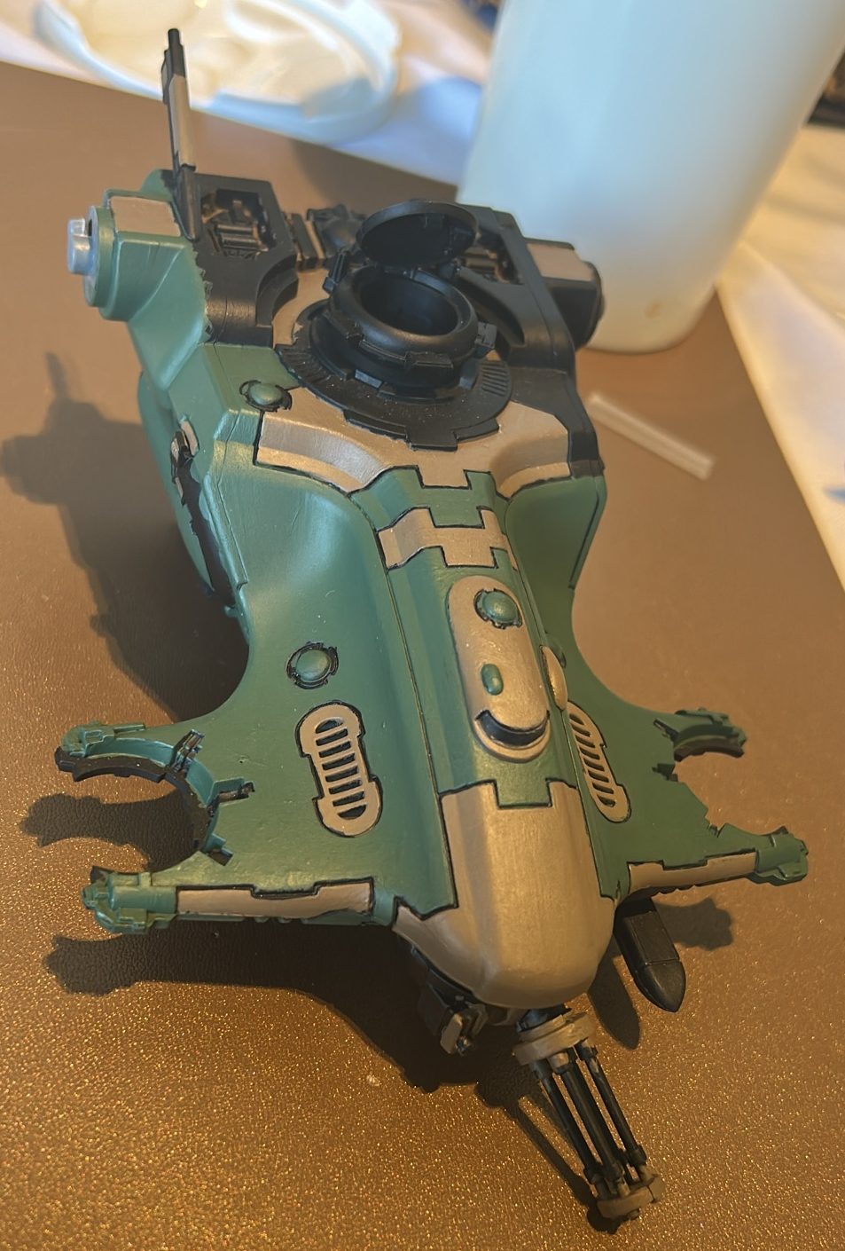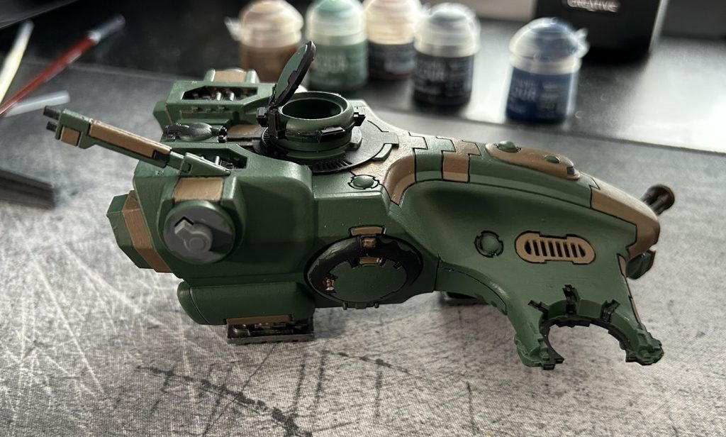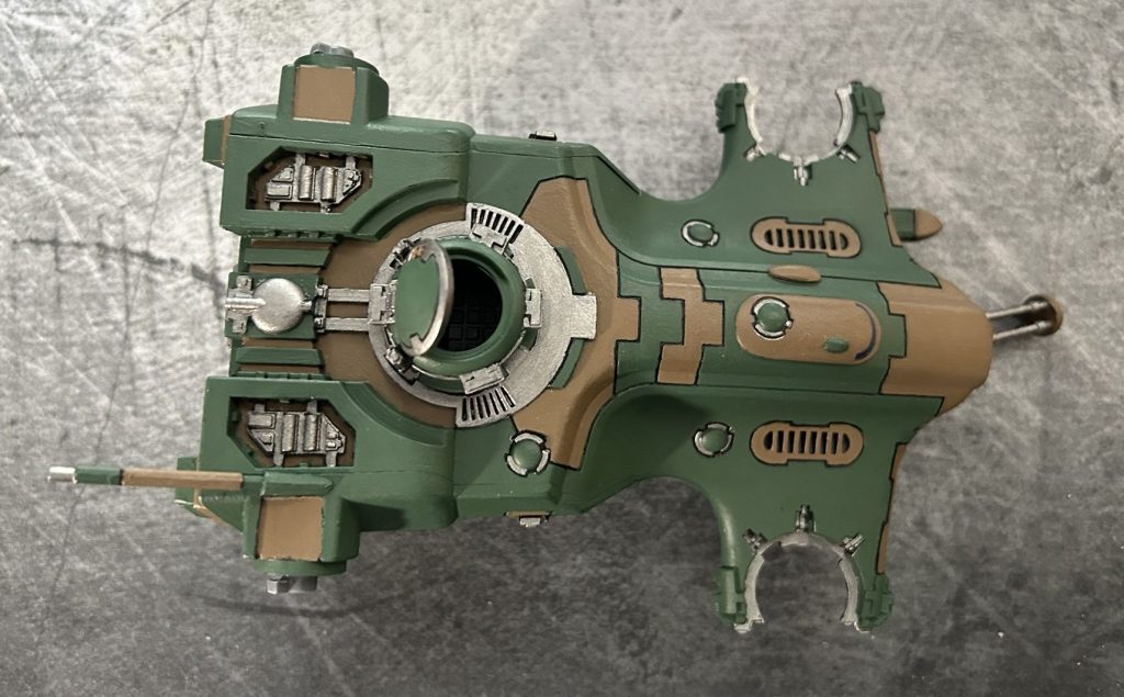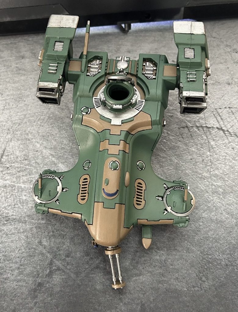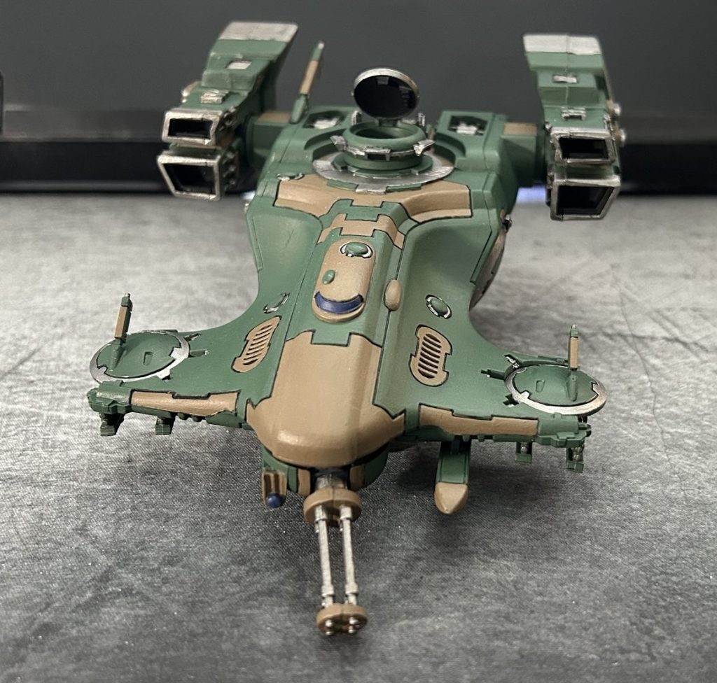 One challenge I hadn’t anticipated was just how time-consuming painting a vehicle would be. Between the main body, two engines, and two gun drones, I spent over 10/15 hours, without even adding highlights to the hard edges and finer details. At this stage, I don’t feel ready to tackle that level of precision, but experienced painters would have spent even longer refining every surface. I look forward to reaching that skill level.