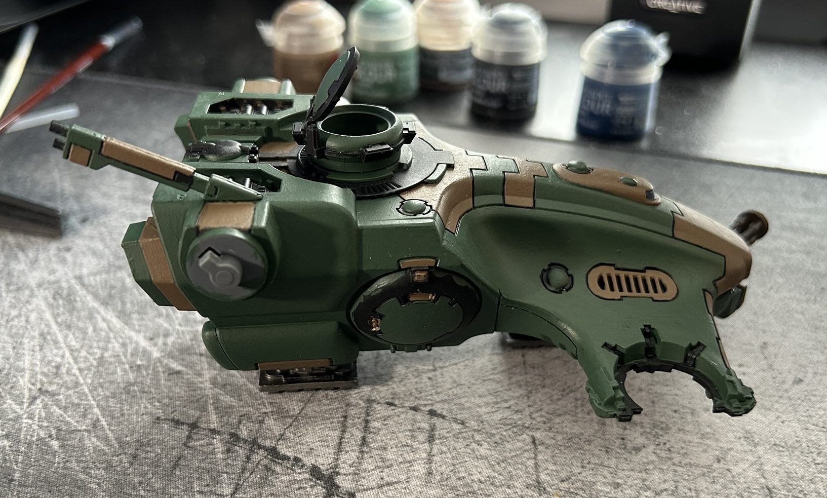 During this process, I made an unfortunate mistake, I broke the lid of the Devilfish. I had initially set it slightly open to show the interior, but I forgot about it while painting the underside, causing it to snap. Lesson learned: always be mindful of delicate parts when handling a model during painting!